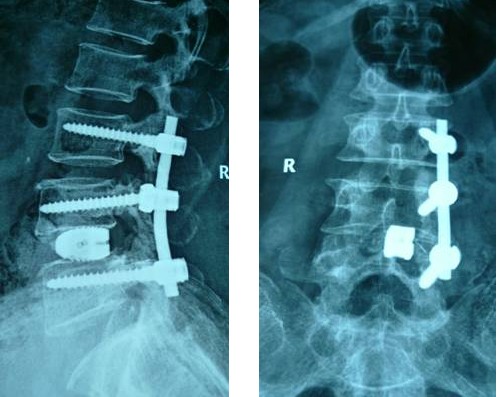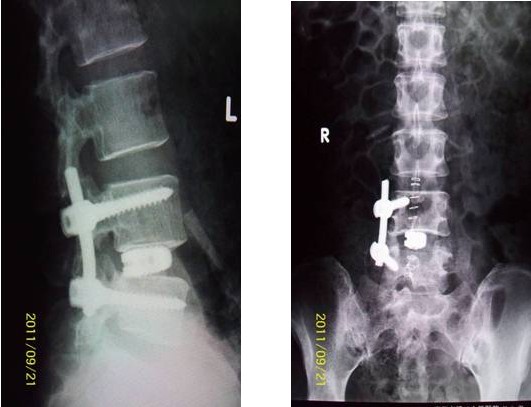 術(shù)后腰椎X線提示單側(cè)釘棒系統(tǒng)固定穩(wěn)妥,椎間隙高度恢復(fù)正常,融合良好。(圖2)