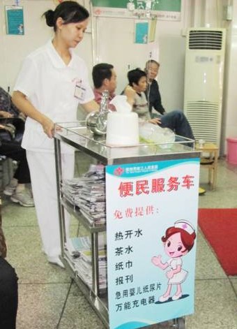 便民服務車為輸液患者提供了航空式的貼心服務,如免費提供報刊、紙巾、熱開(茶)水、萬能充電器及嬰兒紙尿片等。每天,我院的生活服務員帶著甜美的笑容,推著便民服務車,主動為有需要的患者或家屬提供幫助。如向一些無人陪伴的患者主動倒上一杯熱茶;為在座位等待的患者及家屬提供報紙閱讀;如果你的手機剛好沒電了,便民服務車上的萬能充電器可以幫你解決這個問題;而紙尿片則也讓患兒的媽媽覺得非常之省事舒心……
