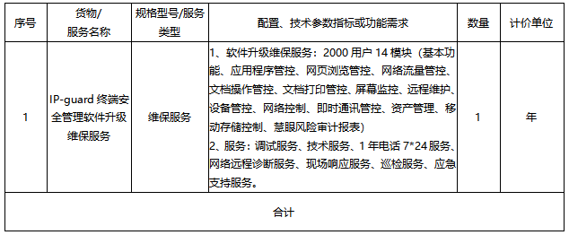 1、軟件版本升級:在質(zhì)保期間,對采購人終端安全管理軟件2000用戶14模塊,提供軟件版本升級服務;需升級到高于目前使用的軟件版本:4.71.0203.0。
