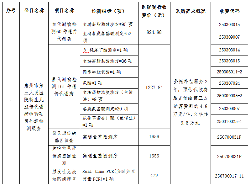 我院擬對新生兒遺傳代謝病檢驗(yàn)項(xiàng)目外送檢測服務(wù)開展市場調(diào)研,公開征集相關(guān)資料。請符合我院功能需求和配置要求,具備合格資質(zhì),具有相應(yīng)檢驗(yàn)檢測服務(wù)能力的公司將相關(guān)資料按要求、在規(guī)定的時(shí)間內(nèi)送達(dá)我院報(bào)名地點(diǎn)。