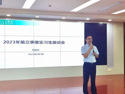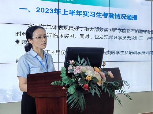 教學(xué)科孔元蓉主任分別從實(shí)習(xí)生考勤情況、宿舍檢查情況及線上出入科的執(zhí)行情況通報了2023年度上半年實(shí)習(xí)生的整體情況。希望各位同學(xué)嚴(yán)格遵守紀(jì)律,善于學(xué)習(xí),主動學(xué)習(xí),在實(shí)習(xí)過程中收獲滿滿。