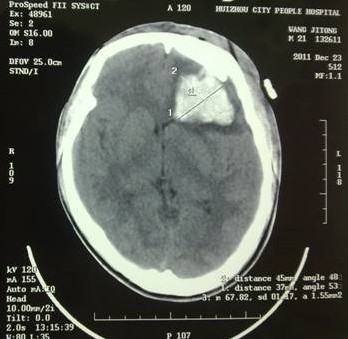 2011年12月,一位患者幾經(jīng)輾轉(zhuǎn)慕名來到我院,求助于余永強(qiáng)主任?;颊邽槟贻p男性,是一名汽修廠工人,由于工作時(shí)輪胎爆炸導(dǎo)致頭部受傷,外院CT提示額骨左側(cè)粉碎性骨折并左額葉腦內(nèi)血腫,血腫量約40ml,已經(jīng)達(dá)到了開顱手術(shù)指征(圖1)。當(dāng)?shù)蒯t(yī)院擬予開顱手術(shù)。但是家屬考慮到開顱手術(shù)的風(fēng)險(xiǎn),同時(shí),由于額骨粉碎性骨折,如果接受傳統(tǒng)開顱血腫清除手術(shù),除了手術(shù)對(duì)腦組織的損傷外,還面臨一個(gè)問題是局部顱骨無法保留,需要再行顱骨修補(bǔ)手術(shù),勢(shì)必增加患者經(jīng)濟(jì)負(fù)擔(dān),也會(huì)在頭部留下不小的手術(shù)疤痕。這對(duì)于一個(gè)二十來歲的年輕人來說也是難以接受的。