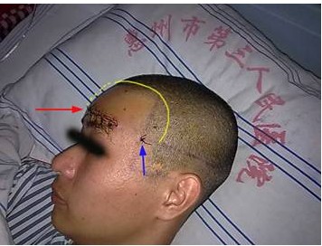 圖3:紅色箭頭所指為頭部外傷傷口,藍(lán)色箭頭所指為微創(chuàng)手術(shù)后穿刺口(直徑3mm),黃色線為傳統(tǒng)開顱手術(shù)頭部切口。示意圖對(duì)比可以看出微創(chuàng)手術(shù)與傳統(tǒng)開顱手術(shù)創(chuàng)傷的明顯差別。
