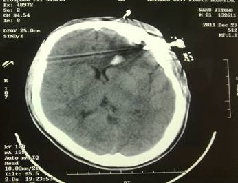 于是家屬慕名求助于我院余永強(qiáng)主任,在傷后第三天轉(zhuǎn)來我院。余永強(qiáng)主任主持術(shù)前討論,決定為患者施行微創(chuàng)手術(shù)清除血腫。通過CT掃描進(jìn)行術(shù)前精確定位,隨后在局麻下進(jìn)行微創(chuàng)手術(shù)。術(shù)中利用余主任設(shè)計(jì)研制的“e形微創(chuàng)手術(shù)定向儀”作引導(dǎo),將穿刺針準(zhǔn)確無誤置入血腫靶心,順利地清除了絕大部分血腫。術(shù)后復(fù)查頭顱CT,血腫清除超過90%(圖2)。憑借微創(chuàng)技術(shù),頭皮僅僅只需要一個(gè)直徑3毫米的小孔,通過一根高科技微創(chuàng)穿刺針,便可達(dá)到同樣的甚至更好的治療效果(圖3)。術(shù)后留置引流1天,第7天即痊愈出院。手術(shù)達(dá)到近乎“完美”的效果!患者親屬大為感慨微創(chuàng)手術(shù)的“神奇”,術(shù)后專程送來錦旗一幅――“微創(chuàng)手術(shù)顯神功” !(圖4)