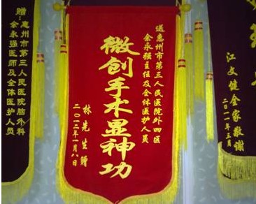 圖4:患者家屬送來的錦旗——“微創(chuàng)手術(shù)顯神功”。