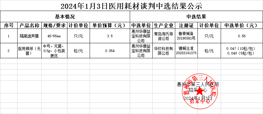 2024年1月3日醫(yī)用耗材談判中選結(jié)果公示
