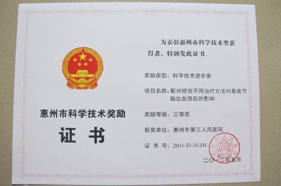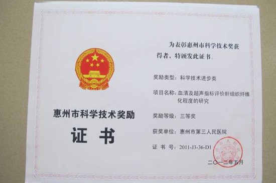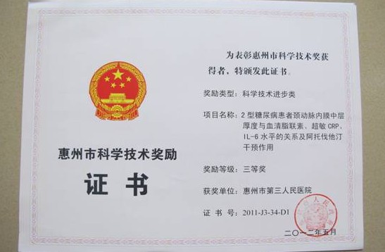 我院共有3項成果獲得科技進步獎三等獎,分別是簡希堯主任等完成的《血清及超聲指標評價肝組織纖維化程度的研究》,黃志勇主任等完成的《配對研究不同治療方法對基底節(jié)腦出血預后的影響》,李桂平主任等完成的《2型糖尿病患者頸動脈內膜中層厚度與血清脂聯素、超敏CRP、IL-6水平的關系及阿托伐他汀干預作用》。本年度全市共有88項成果獲獎,在惠城區(qū)的獲獎單位中,我院獲獎總數名列前茅。表明我院在科學技術研究方面已逐步形成氣候,并取得了令人鼓舞的成績!