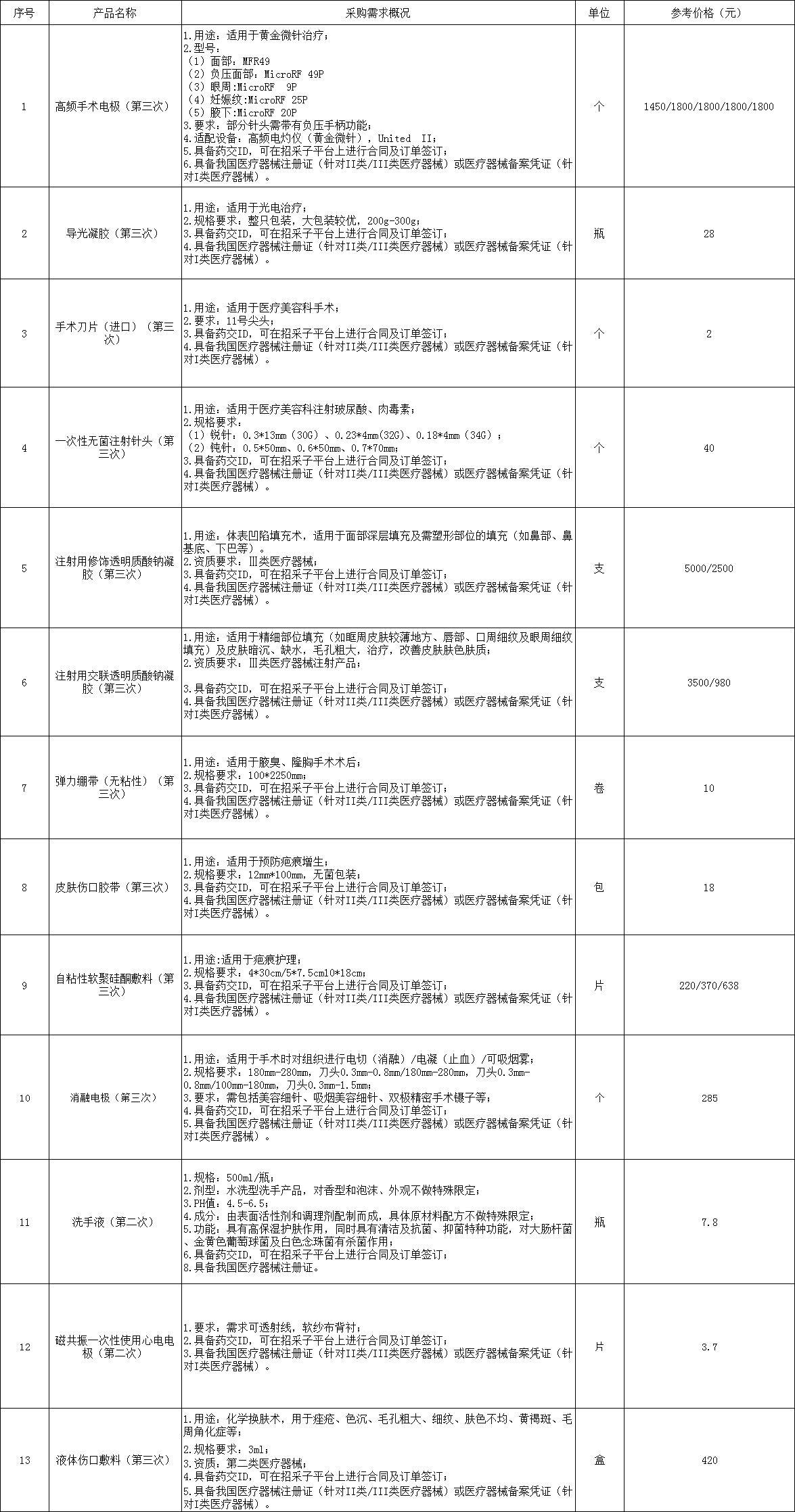(5)如報名多個醫(yī)用耗材項目,應(yīng)將所需報名的醫(yī)用耗材產(chǎn)品談判填入報名產(chǎn)品明細表,明細表必須以表格形式提交。