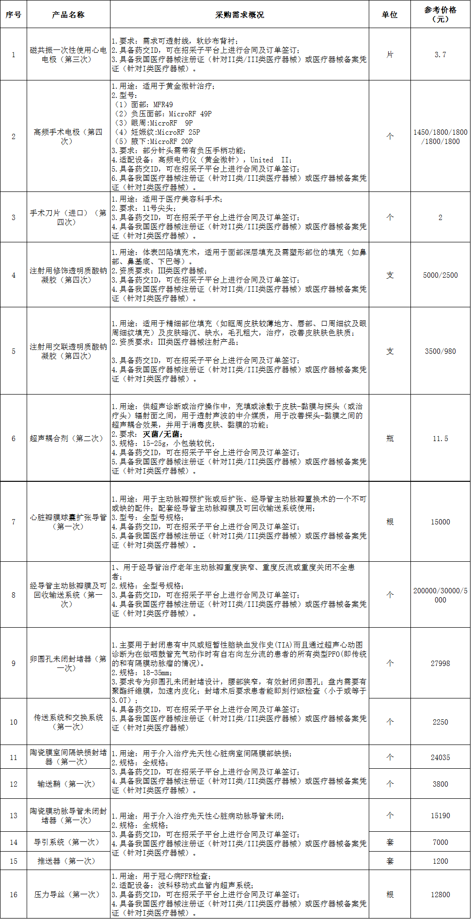 (5)如報名多個醫(yī)用耗材項(xiàng)目,應(yīng)將所需報名的醫(yī)用耗材產(chǎn)品談判填入報名產(chǎn)品明細(xì)表,明細(xì)表必須以表格形式提交。