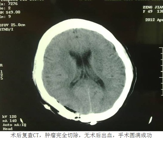 憑借先進(jìn)的技術(shù)與豐富的經(jīng)驗(yàn),換來的是患者快速的康復(fù)。由于手術(shù)核心部分均是在顯微鏡下操作,在完整切除腫瘤的同時,最大限度減少了對周圍正常腦組織的損傷,術(shù)中出血很少,因此術(shù)后患者沒有出現(xiàn)任何中樞感染、神經(jīng)功能障礙等異常情況,復(fù)查頭顱CT顯示腫瘤完整切除,無術(shù)后出血。術(shù)后第十天,患者即痊愈出院。