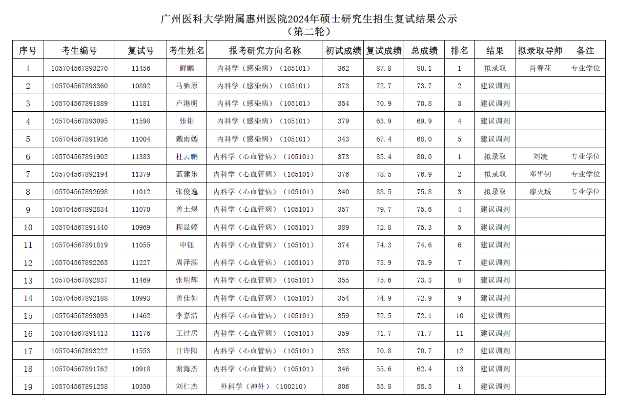廣州醫(yī)科大學(xué)附屬惠州醫(yī)院2024年碩士研究生招生第二輪復(fù)試結(jié)果公示
