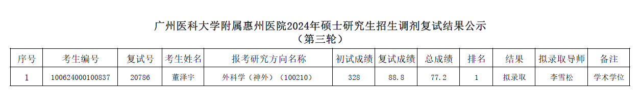 廣州醫(yī)科大學(xué)附屬惠州醫(yī)院2024年碩士研究生招生第三輪復(fù)試結(jié)果公示