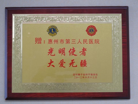 2012年7月18日,我院收到來自深圳市獅子會和平服務隊寄來的牌匾——“光明使者,大愛無疆”。