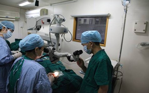“復明2號”狹小的手術間,周靈主任正在為一名白內(nèi)障村民做手術