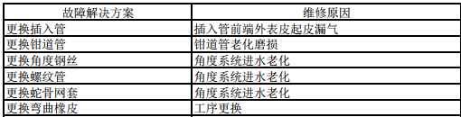 插入管前段有破損漏氣,經(jīng)檢修插入管破損,橡皮破損。另外檢修發(fā)現(xiàn)角度系統(tǒng)老化、鉗道管老化,需要更換,詳見附件2;