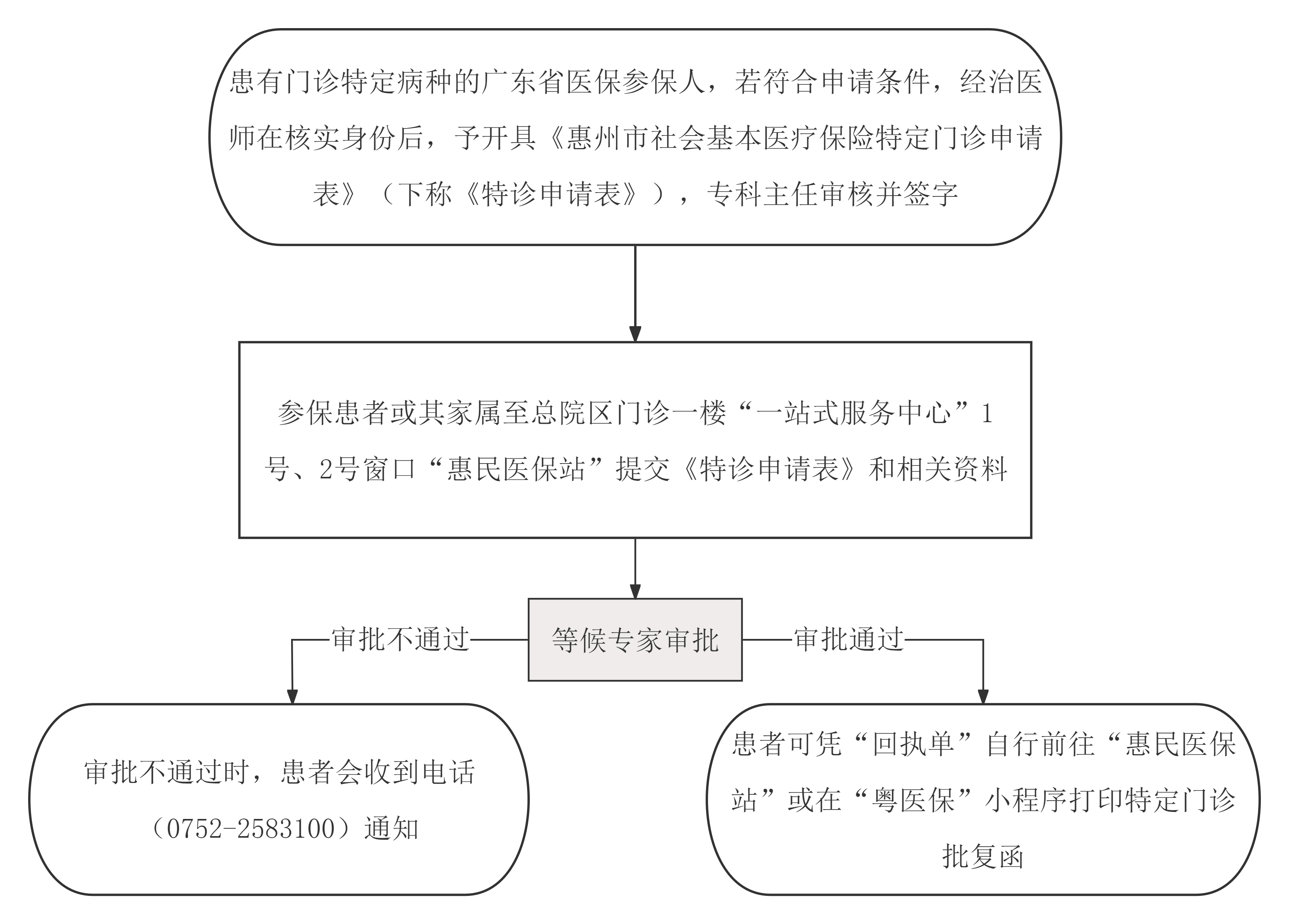 辦理流程如下:參保人持相關(guān)就醫(yī)病歷資料前往對(duì)應(yīng)專科主診醫(yī)師審核條件符合后填寫(xiě)《惠州市基本醫(yī)療保險(xiǎn)特定門(mén)診申請(qǐng)審批表》??浦魅吾t(yī)師簽字同意相關(guān)資料提交至惠州市第三人民醫(yī)院總院區(qū)門(mén)診一樓一站式服務(wù)中心1號(hào)、2號(hào)窗“惠民醫(yī)保站”醫(yī)保物價(jià)科復(fù)核無(wú)誤后出具《門(mén)慢門(mén)特登記信息表》。