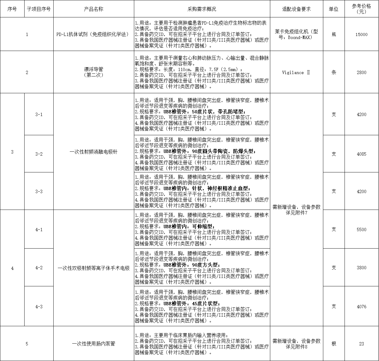 6、項(xiàng)目3-一次性射頻消融電極針、項(xiàng)目4-一次性雙極射頻等離子體手術(shù)電極設(shè)備參數(shù)需求(附件7);