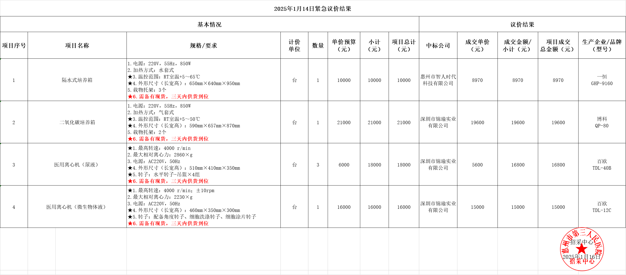 惠州市第三人民醫(yī)院20250114緊急議價結(jié)果公示