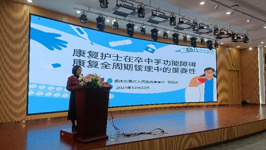 惠州市第三人民醫(yī)院副主任護(hù)師梁麗娜分享了《康復(fù)護(hù)士在卒中后手功能障礙康復(fù)全周期管理中的重要性》專題,從護(hù)理意義、技術(shù)、注意事項(xiàng)方面闡述了全周期手功能康復(fù)護(hù)理。