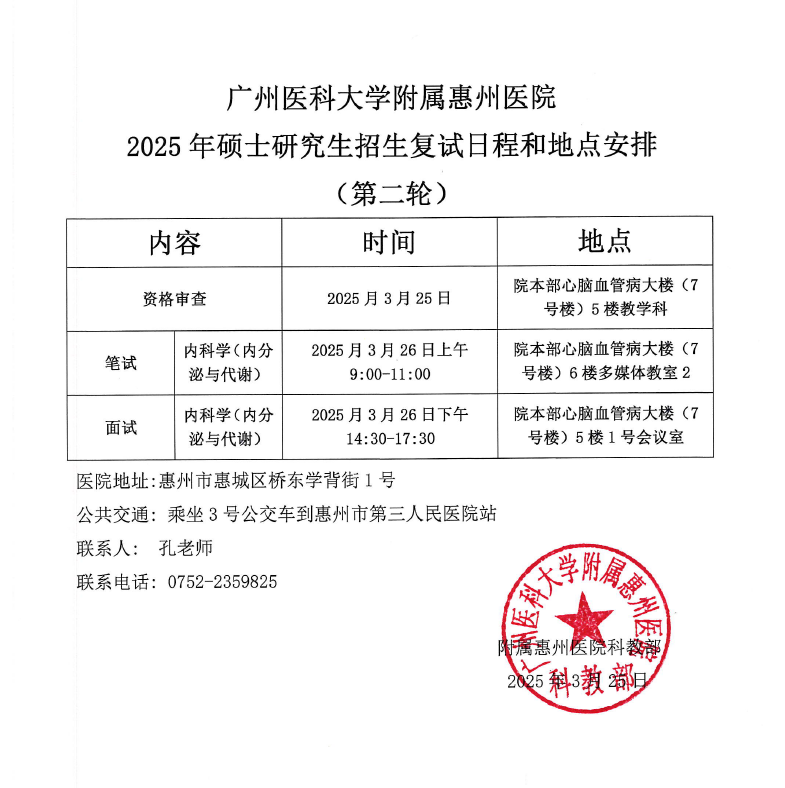 附件:廣州醫(yī)科大學附屬惠州醫(yī)院 2025年碩士研究生招生復試日程和地點安排 (第二輪)
