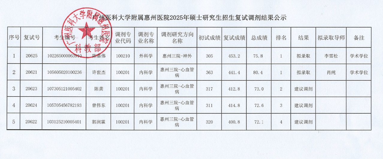 附件:廣州醫(yī)科大學附屬惠州醫(yī)院2025年碩士研究生招生復試調劑結果