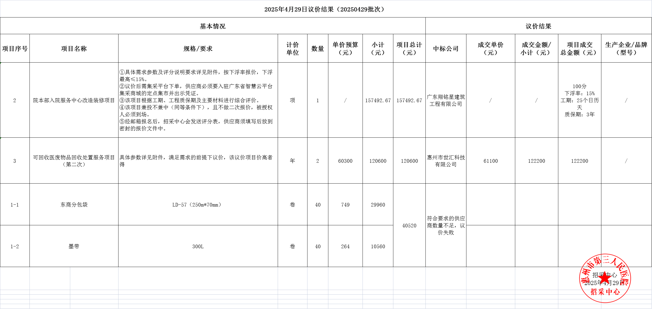 惠州市第三人民醫(yī)院20250429議價(jià)結(jié)果公示