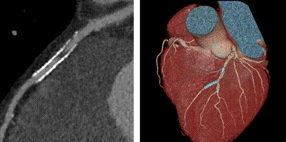 高清模式突破了傳統(tǒng)CT對支架內(nèi)斑塊觀察的難點(diǎn),能夠提供冠脈支架內(nèi)腔的高清圖像。