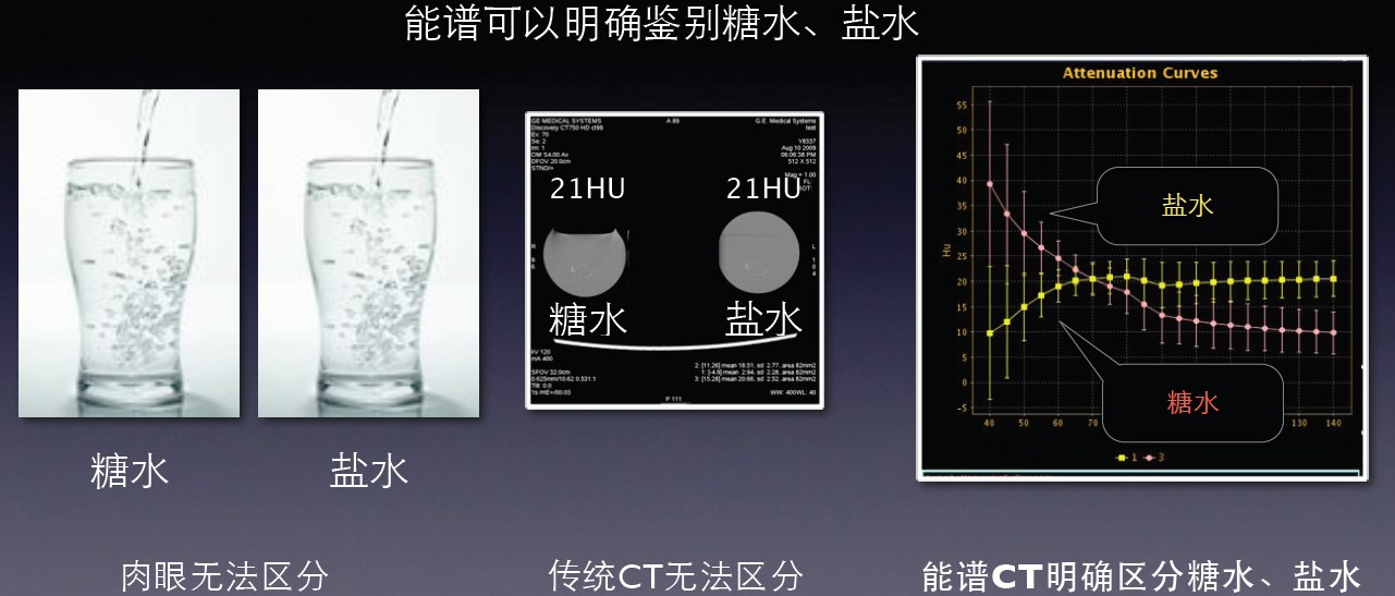 能譜曲線體現(xiàn)了不同物質(zhì)對X線的吸收程度,從而體現(xiàn)了物質(zhì)本身的結(jié)構(gòu)特性。從以下的糖水及鹽水的例子可以看出,在常規(guī)CT上表現(xiàn)為同樣CT值-即無法區(qū)分的糖鹽水卻表現(xiàn)為完全不一樣的能譜曲線,從而讓我們可以區(qū)分它們。