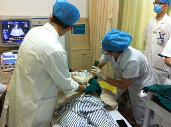 7月18日下午,在我院超聲科7號(hào)診室我們成功完成了首例腎穿刺活檢術(shù),標(biāo)志著我院結(jié)束了不能獨(dú)立開展腎穿刺活檢術(shù)的歷史。術(shù)前,我們經(jīng)過了很多次的模擬試穿以及做好了預(yù)防各種并發(fā)癥的充分準(zhǔn)備。術(shù)中在ICU科龍宏杰主任、腎內(nèi)科姚筱主任、超聲科馬曉芹主任、黃劍毅醫(yī)生及腎內(nèi)科護(hù)士們的鼎力協(xié)助下,我科曾曦醫(yī)生通過彩超進(jìn)行了精確定位,姚主任在超聲的引導(dǎo)下,成功地為患者進(jìn)行經(jīng)皮腎臟穿刺活檢術(shù),整個(gè)操作過程準(zhǔn)確流暢。