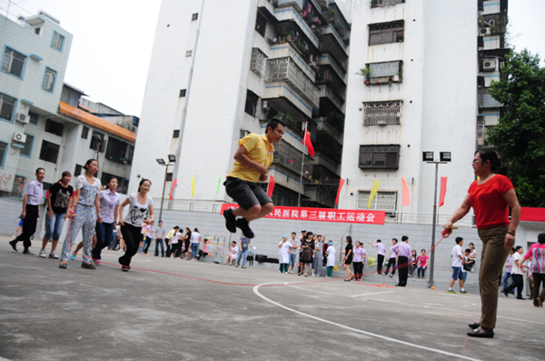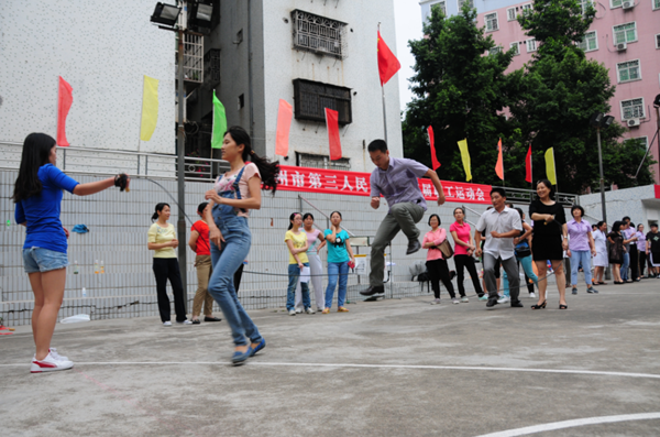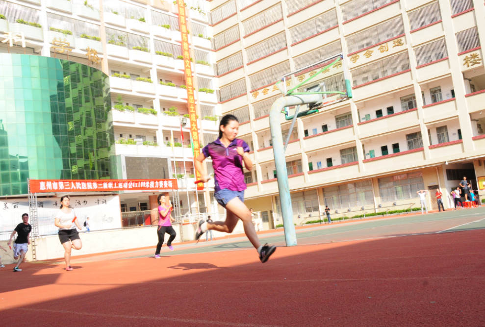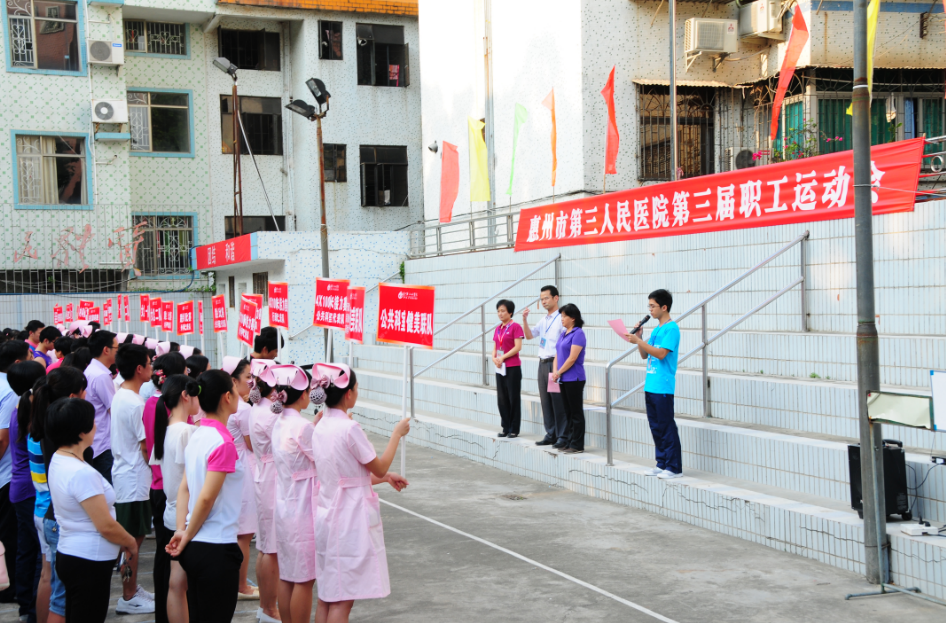 2013年10月11日,惠州市第三人民醫(yī)院第三屆職工運動會開幕式在籃球場隆重召開。本屆運動會從8月至10月,歷時2個月,設有籃球、集體跳繩、4*100米接力、袋鼠障礙跳及健美操5個比賽項目,全院近600名干部職工積極參與了本次活動。運動員們發(fā)揚“團結、和諧、健身、拼搏”的精神,賽出了風格、賽出了友誼、賽出了成績,弘揚了三院文化精神、展現(xiàn)了三院職工的風采。