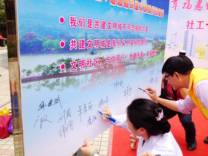 市委副書記、市社工委主任陳訓(xùn)廷參加活動(dòng)并宣布活動(dòng)啟動(dòng),并在惠州文明創(chuàng)建宣傳板上帶頭簽上了自己的名字。市民政局局長陳偉良、市文明局局長韓維斌也到場參加指導(dǎo)當(dāng)天活動(dòng),各社工機(jī)構(gòu)及志愿者團(tuán)隊(duì)包括惠州市第三人民醫(yī)院志愿者服務(wù)隊(duì)等對(duì)本次活動(dòng)紛紛給予大力支持,活動(dòng)當(dāng)天吸引了數(shù)百名附近居民前來觀看、咨詢。志愿者們積極向群眾發(fā)放服務(wù)宣傳資料,為群眾居民提供便民服務(wù)。