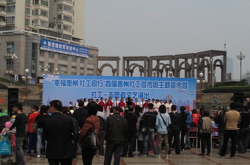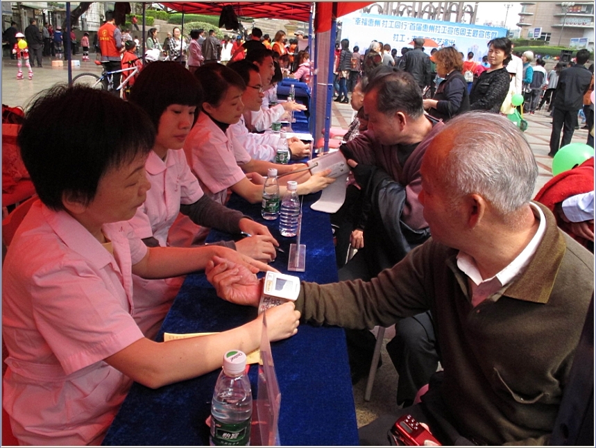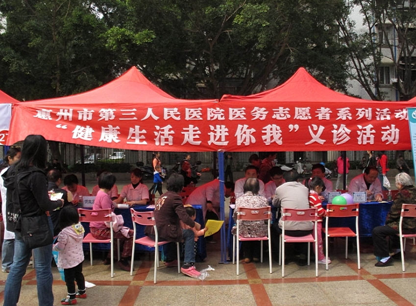 我院志愿者服務(wù)隊(duì)在首屆“惠州市社工周”文藝演出活動(dòng)現(xiàn)場(chǎng)為市民開展義診活動(dòng)
