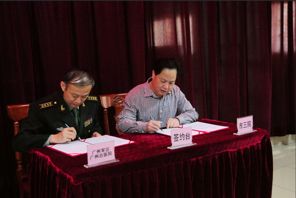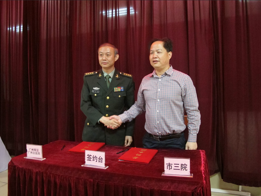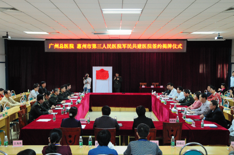 3月25日上午,我院與廣州軍區(qū)總醫(yī)院“軍民共建醫(yī)院”簽約揭牌儀式在我院多功能會議室隆重舉行?;葜菔熊姺謪^(qū)政委、惠州市委肖紅常委、廣州總醫(yī)院萬金平副政委、惠城區(qū)委陳娟常委、惠城區(qū)衛(wèi)生局鄒忠平局長等出席了儀式。簽約后,兩家醫(yī)院將展開全面的技術合作,從總體上提升我院診療技術水平。