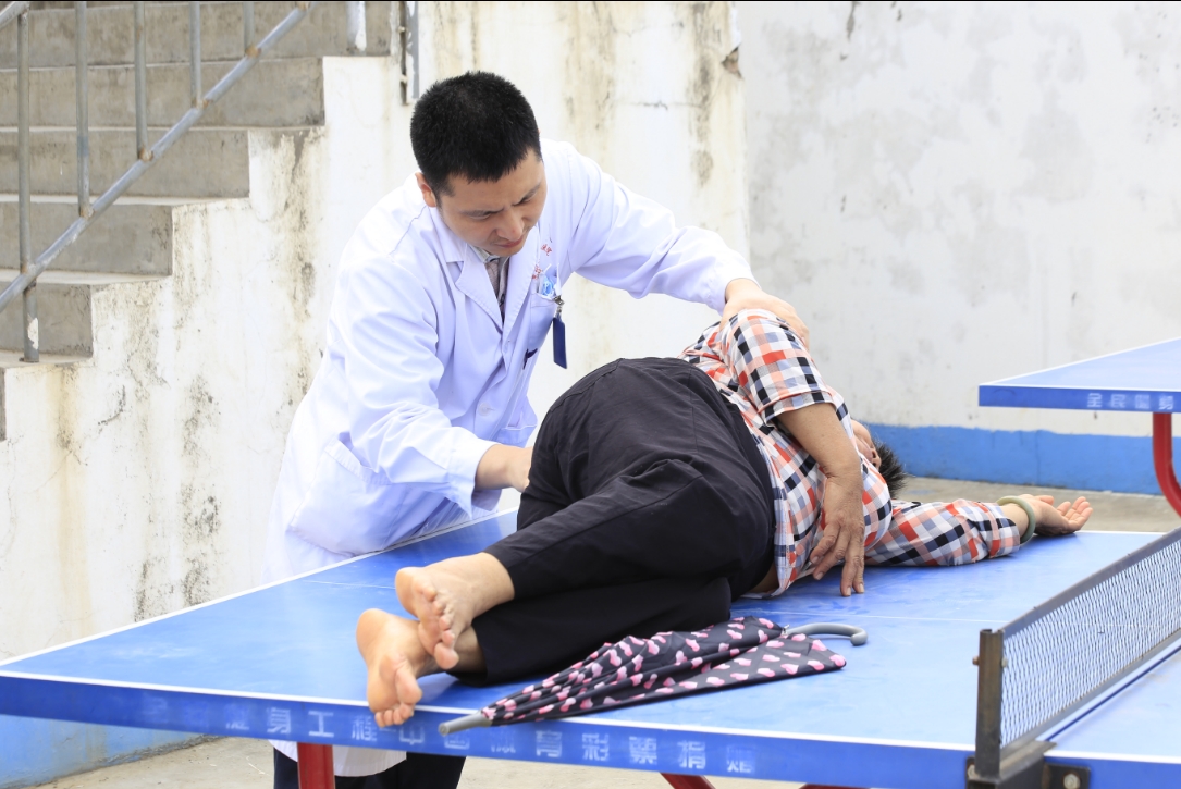 由于現(xiàn)場條件有限,骨科孫進(jìn)醫(yī)生只能將球臺作為診床,對患者進(jìn)行骨骼檢查