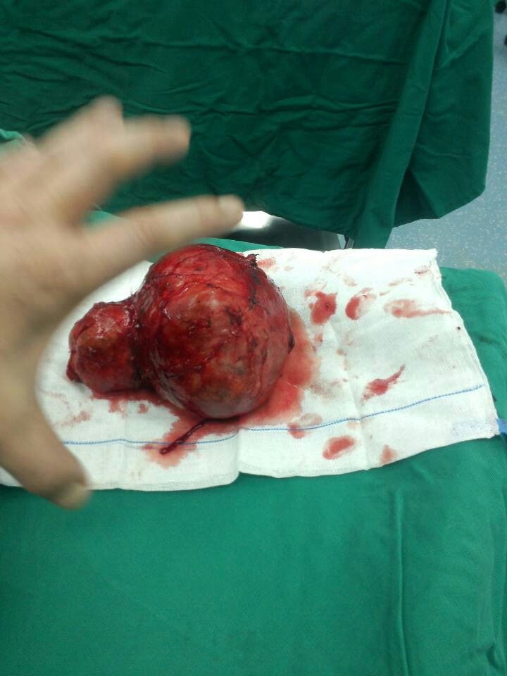 就在2014年3月底,某患者頸部患有巨大甲狀腺結(jié)節(jié)來(lái)我院治療,因缺乏對(duì)疾病的認(rèn)識(shí),腫物又沒(méi)有影響到日常生活,所以一直未引起重視治療。十多年來(lái)逐漸變大,近一年明顯增大,腫物以壓迫氣管向外突出,伴有憋氣現(xiàn)象。每晚夜不能寐,脾氣焦慮暴躁。該患者曾在惠東一帶就醫(yī),檢查后均已腫物過(guò)大,與血管分界不清,手術(shù)風(fēng)險(xiǎn)過(guò)大而委婉拒絕并推薦到上級(jí)醫(yī)院救治。后經(jīng)熟人介紹,患者和家屬抱著一絲希望來(lái)我院普外科入院治療。