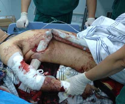 在5月10日凌晨1點(diǎn)左右,惠州市第三人民醫(yī)院急診出車搶救一名30歲男性患者車禍傷,病人右胸上地插著一個(gè)路邊防護(hù)鋼柱,鋼柱嚴(yán)重變形成“7”型,令人觸目驚心。整條右手從肱骨、尺橈骨都出現(xiàn)粉碎性骨折和大面積組織缺損,患者呈休克癥狀。我們隨之馬上通知心胸外科、骨科、普通外科等多科室會(huì)診,情況危急,立馬送往手術(shù)室緊急手術(shù),搶救生命!
