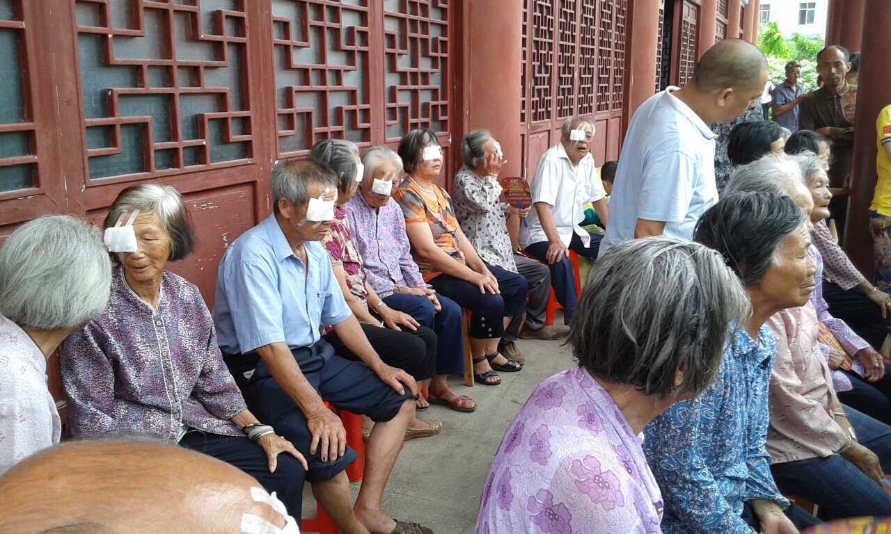 阿公阿婆們等待醫(yī)生為他們做術(shù)后視力檢查