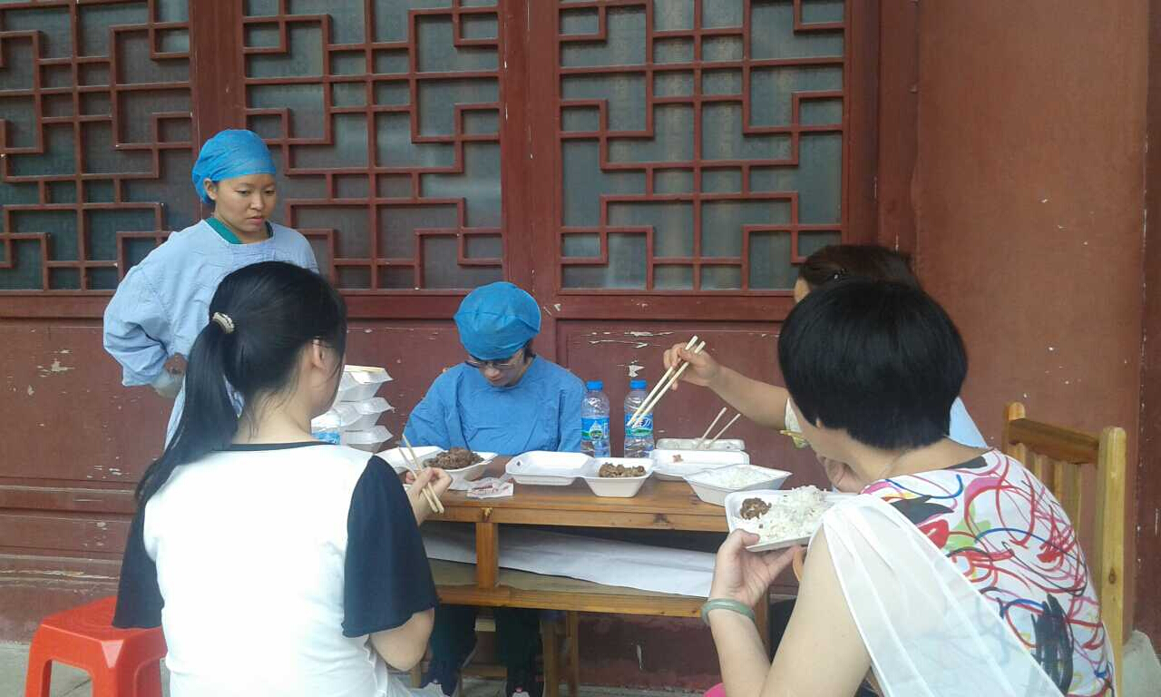 忙碌過(guò)后三院醫(yī)護(hù)人員爭(zhēng)取一點(diǎn)點(diǎn)時(shí)間在簡(jiǎn)陋的桌上吃著快餐