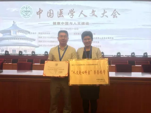 2017年9月7日-9日,以“健康中國與人文建設”為主題的中國醫(yī)學人文大會在北京開幕?;葜萑荷窠?jīng)外科神經(jīng)重癥負責人廖品君副主任醫(yī)師和服務管理部李林枝主任參加了此次大會并領(lǐng)回了由中國醫(yī)師協(xié)會和白求恩精神研究會授予的“人文愛心科室”牌匾和證書。
