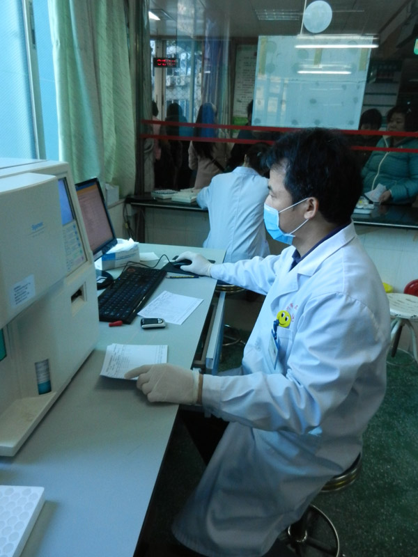 “陳組長,還沒下班啊”?交接完夜班后,已經(jīng)是晚上六點了,我看見他還在埋頭維修著儀器。旁邊的同事接上話說:“今天早上儀器壞了,組長他一直修到現(xiàn)在,中午飯還沒吃呢!”聽了頓時心里一震,晚飯時間都到了,中午飯還沒吃,我說再忙也要吃飯啊。他皺了皺眉頭說:“儀器有故障、只有快點把儀器修好,及時把報告單發(fā)出去才不會耽誤病人看病。”