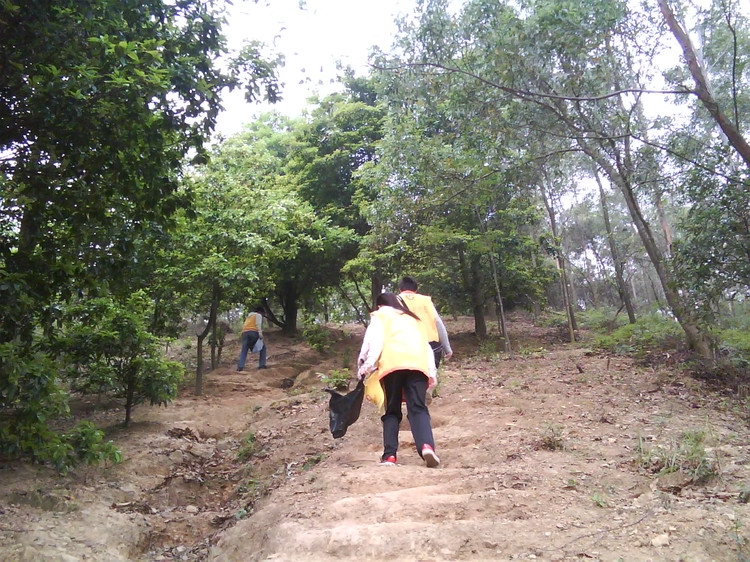 我和朋友登上亭子的二樓,顧不上流連美麗的山景,傾聽山鳥的旋律,因?yàn)檠巯履瞧包S馬甲”就是最靚麗的風(fēng)景。我們猜他們是惠州學(xué)院的學(xué)生,是一群充滿朝氣,熱愛生活熱愛自然的環(huán)保主義者。那一次次的彎腰,拾起的不單是垃圾,也是一種文明和修養(yǎng);那一張張標(biāo)語,寫下的不只是文字,也是一種誠摯的呼喚和希望。他們就像一群快樂可愛的黃精靈,用自己的實(shí)際行動(dòng),為美麗的山林帶來和諧的景象。