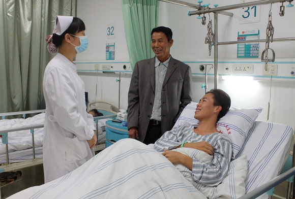 先給病人遞上一杯水,然后在自我介紹、介紹管床醫(yī)生、病區(qū)主任、護長、科室的環(huán)境、病房電器設備的使用等。