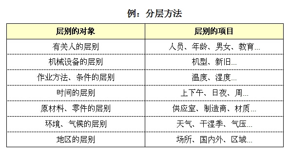 需要注意的是,應(yīng)在收集數(shù)據(jù)之前使用層別法,先進(jìn)行層別化,再開始收集數(shù)據(jù)(在做查檢時(shí),考慮適當(dāng)分類)。