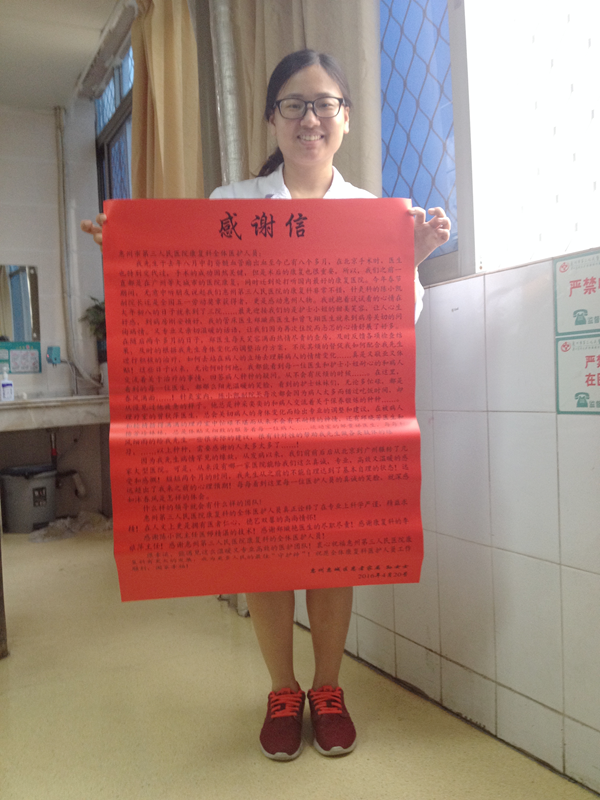 感謝陳小凱主任醫(yī)師精湛的技術(shù)!感謝鄭璇燕醫(yī)生的盡職盡責(zé)!感謝康復(fù)科的李旅萍主任!感謝惠州第三人民醫(yī)院康復(fù)科的全體醫(yī)務(wù)人員!很幸運(yùn),能遇見(jiàn)這么溫暖又專(zhuān)業(yè)高效的醫(yī)護(hù)團(tuán)隊(duì)!衷心祝?;葜莸谌嗣襻t(yī)院康復(fù)科有更大的發(fā)展,成為更多人民的最佳“守護(hù)神”!