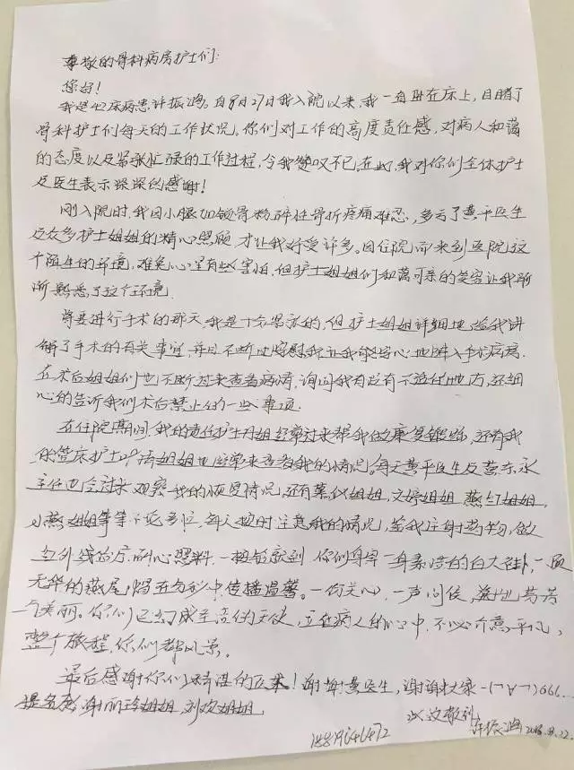 今天,42床的振鴻弟弟出院了,17歲。8月27日我夜班收的,因?yàn)轵T車摔傷致腓骨和鎖骨骨折,上兩個(gè)星期手術(shù),康復(fù)得還不錯(cuò),臨走時(shí)寫了一封讓人煽然淚下的感謝信,他說(shuō)躺在床上看到我們醫(yī)護(hù)的一言一行,令他贊嘆不已。他說(shuō)我們和藹可親的笑容使他不害怕骨折給他帶來(lái)的恐懼,他說(shuō)我們溫柔的講解使他不害怕即將到來(lái)的手術(shù),他說(shuō)因?yàn)槲覀冎魅?、護(hù)士長(zhǎng)、管床醫(yī)生、責(zé)任護(hù)士經(jīng)常巡視查問(wèn)病情病房,才使他那么快可以出院……