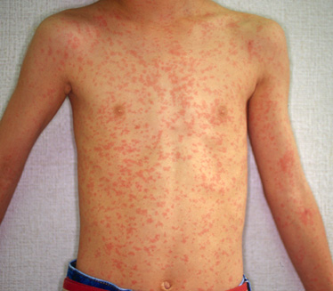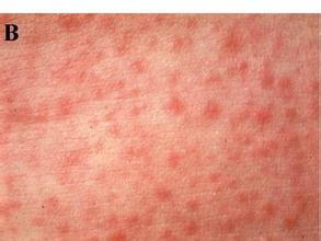 一般第4天出現(xiàn)鮮紅色或玫瑰色的細(xì)小斑丘疹,皮疹先在耳后、頸部、發(fā)際出現(xiàn),逐漸由上而下蔓延到前額、面部、軀干四肢、手掌及足底。皮疹可相互融合成片,壓之褪色,疹間皮膚正常。皮疹2~5天出全,在出疹時(shí)體溫上升可達(dá)40℃左右,中毒癥狀加重,精神委靡、咳嗽加重、兩眼紅腫、聲音嘶啞,有時(shí)出現(xiàn)腹瀉。肺部呼吸音增粗、頸淋巴結(jié)和肝脾腫大。隨著體溫逐漸恢復(fù),皮疹依出疹順序消退,附有糠秕樣細(xì)屑并留下淺褐色色素沉著。民間歸納為三齊、四透、五退、七凈。