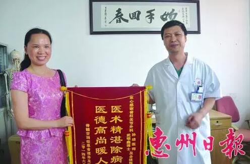 這天,來自湖南益陽農(nóng)村的一名罕見的脊髓空洞患者諶女士就要出院了。她和妹妹一家人高興得就像過節(jié)似的,對惠州市第三人民醫(yī)院骨科醫(yī)學(xué)中心主任、主任醫(yī)師、惠州市著名脊柱外科專家武明鑫博士再三表示感謝,并向武主任贈送了一面寄托著全家人謝意的錦旗,上書“醫(yī)術(shù)精湛除病,醫(yī)德高尚暖人”。