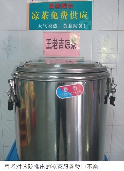 每天上午9時~下午4時,我院在門診大廳前線服務(wù)中心對面為病人提供一款涼茶,有夏桑菊、王老吉、菊花茶、羅漢果涼茶等,并在電子屏幕設(shè)置了溫馨提示。在涼茶供應(yīng)處我們可以看到,不時有候診的病人前來飲用涼茶,并對我院如此貼心的服務(wù)贊口不絕。雖然只是小小的一杯涼茶,但卻是我院貫徹落實“三好一滿意”的最好表現(xiàn)。