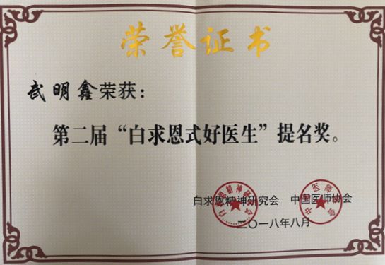 2018年8月30日-31日,“中國(guó)醫(yī)學(xué)人文大會(huì)”在北京隆重舉行!大會(huì)宣讀了榮獲“全國(guó)人文愛(ài)心醫(yī)院”和“白求恩式好醫(yī)生”名單?;葜萑汗强漆t(yī)學(xué)中心主任武明鑫博士榮獲“白求恩式好醫(yī)生”提名獎(jiǎng)!