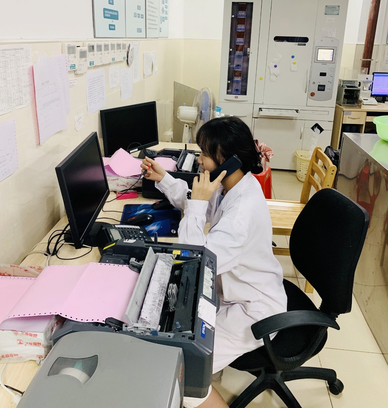 藥師b立刻向醫(yī)院消防監(jiān)控中心報警。報告:門診大樓1樓綜合藥房“出院帶藥”發(fā)藥窗口電腦下方的電排插著火,已開始有火花,報警人藥師b。